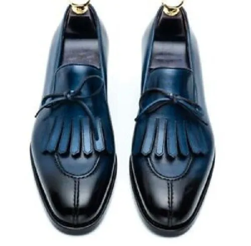 Handmade Men Blue Slip on Shoes with Fringes, Men Blue Formal Dress shoes