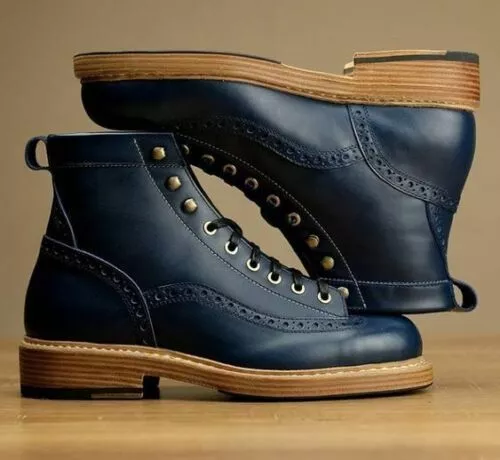New Handmade Men's Navy Blue Lace up Leather Ankle High Formal Leather Boots