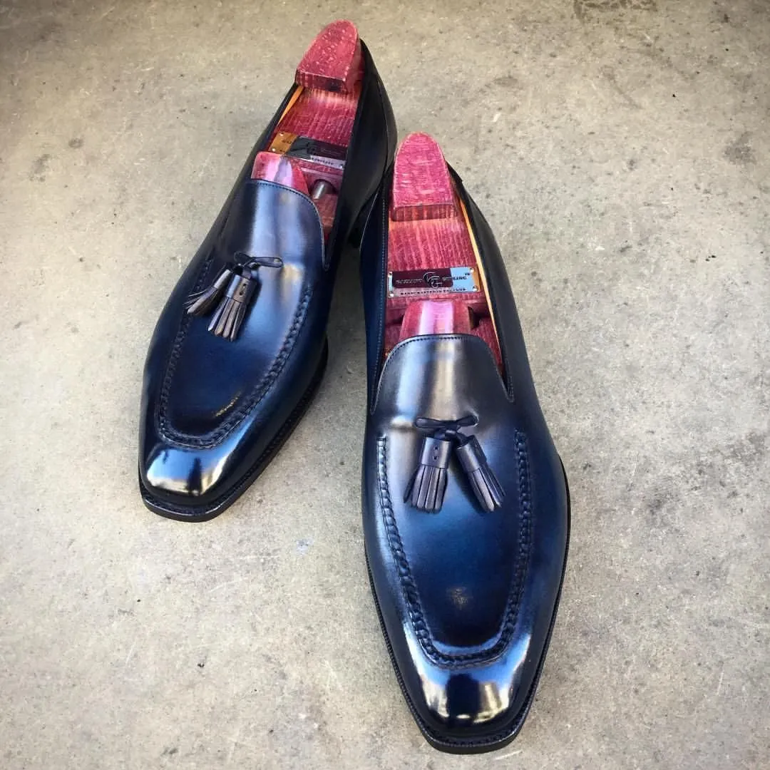 Handmade Men's Tassel Loafer Blue Cowhide Leather Moccasins Dress Formal Shoes