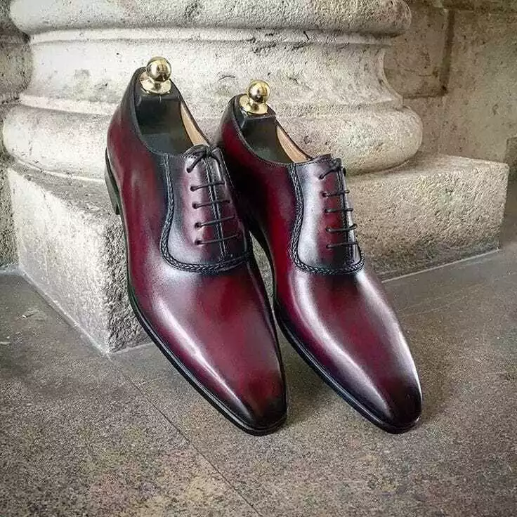 Handmade Men's Burgundy Leather Oxford Chiseled Toe Lace Up Dress Formal Shoes