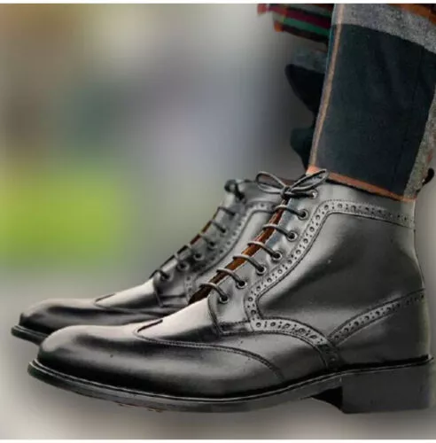 New Handmade Men's Black Leather Brogue Boots, Men Leather High Ankle Boots