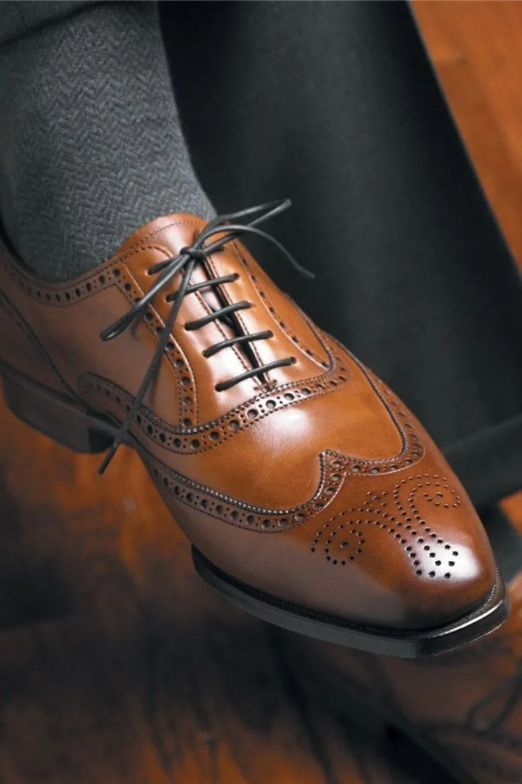 Handmade Men's Brown Leather Wingtip Medallion Chiseled Toe Lace Up Oxford Shoes