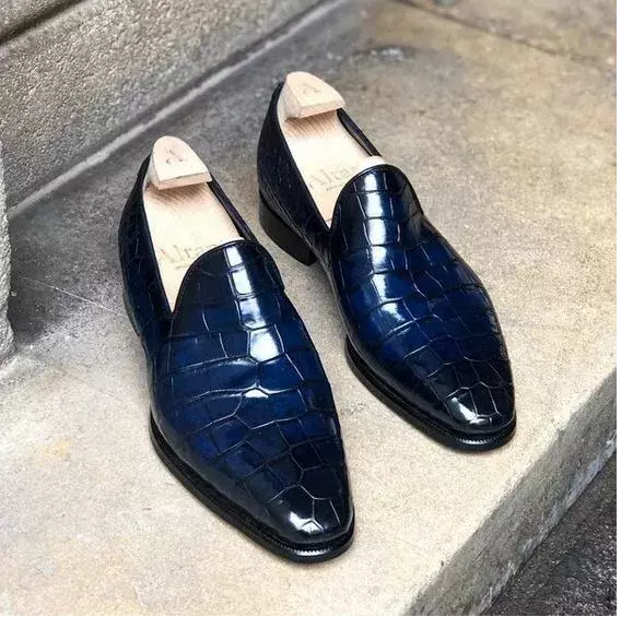 Handmade men blue crocodile moccasin shoes, dress formal slip on shoes for mens