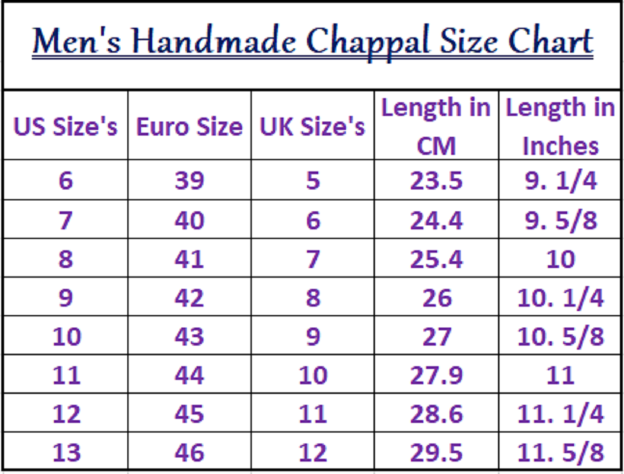 Size. (required measurement for Perfect fit) We can custom make these Sandal's/Chappal in all sizes; the standard measurements are given in SIZE CHART IMAGE. Please feel free to ask size related questions. You can also provide us with your exact measurements to get the best fit for yourself.