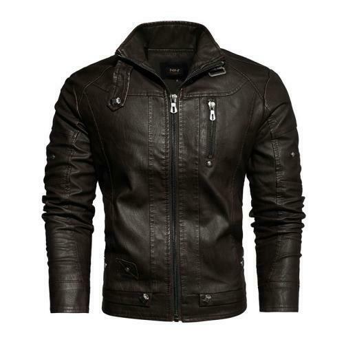 Men's Stand Collar Faux Leather Jacket Zipper Slim Fit Motorcycle Biker Jacket