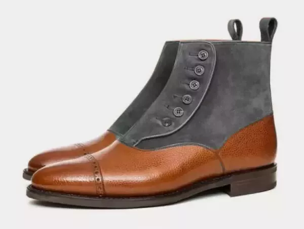 New Men Button Boot Brown Gray Cap Toe Style Handmade